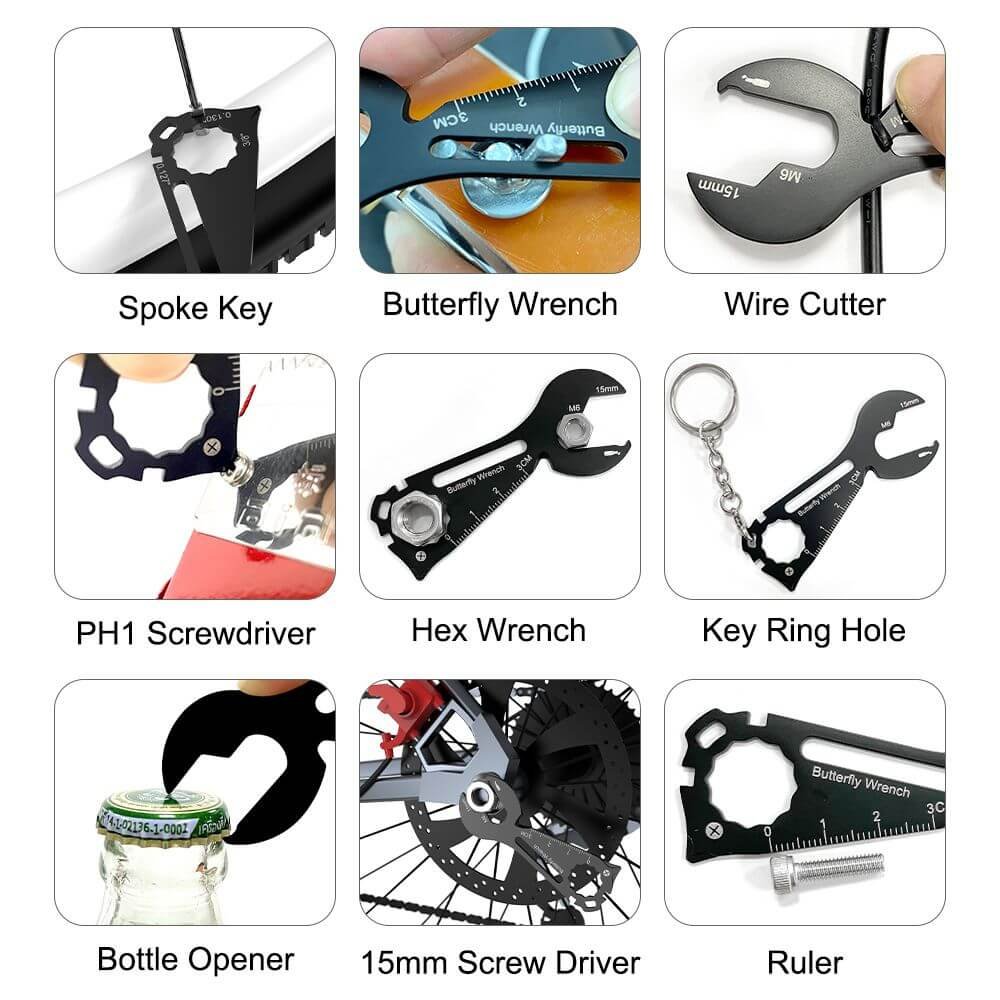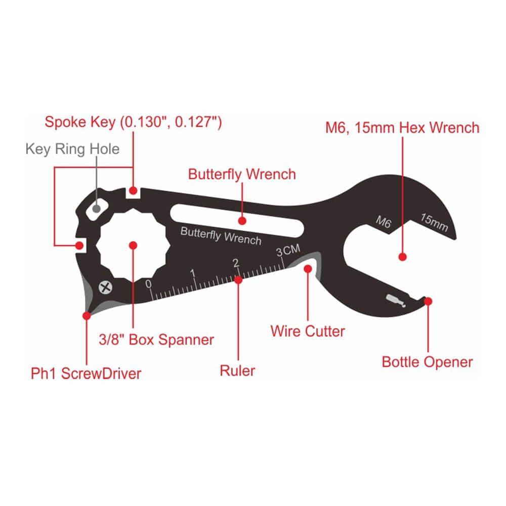 This wrench keychain multitool packs real functionality into a compact, pocket-ready design. Built for EDC (Everyday Carry) en DIY use, it combines a wrench, screwdriver, wire cutter, bottle opener, ruler, spoke key, and more into a single ultra-light tool that lives on your keychain.